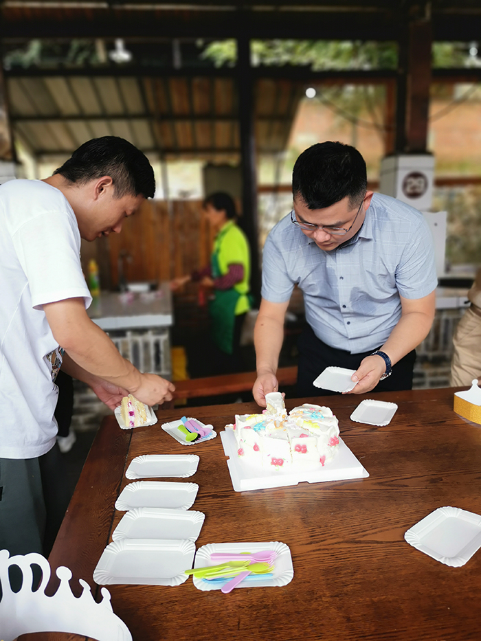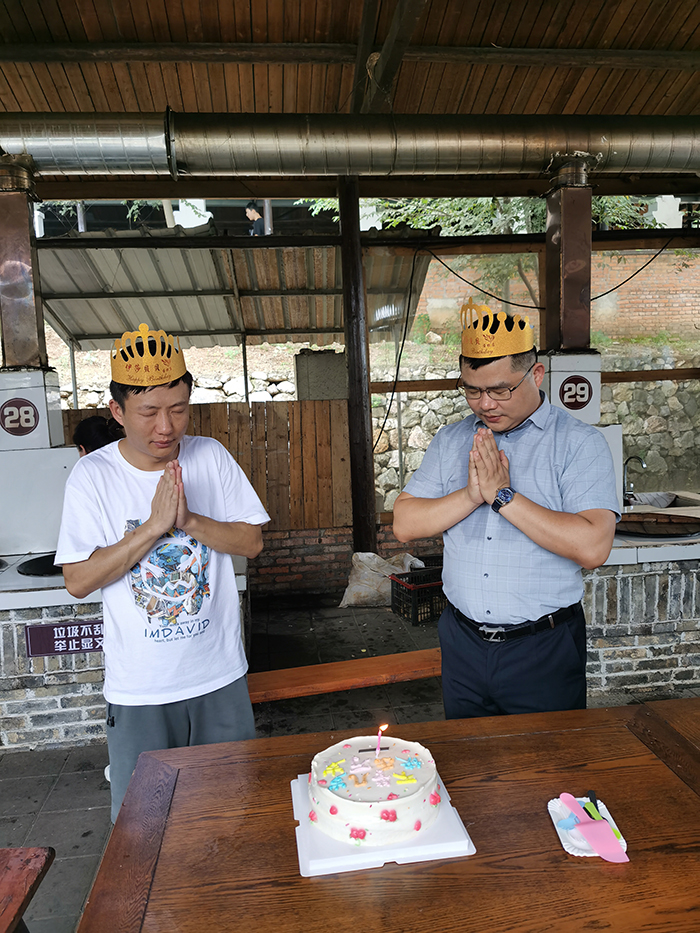 2021年8月29日。肥东蓝山湾,在中午品尝了团队协作做出的一桌大锅灶美食后,大家一起为2位同事过生日。